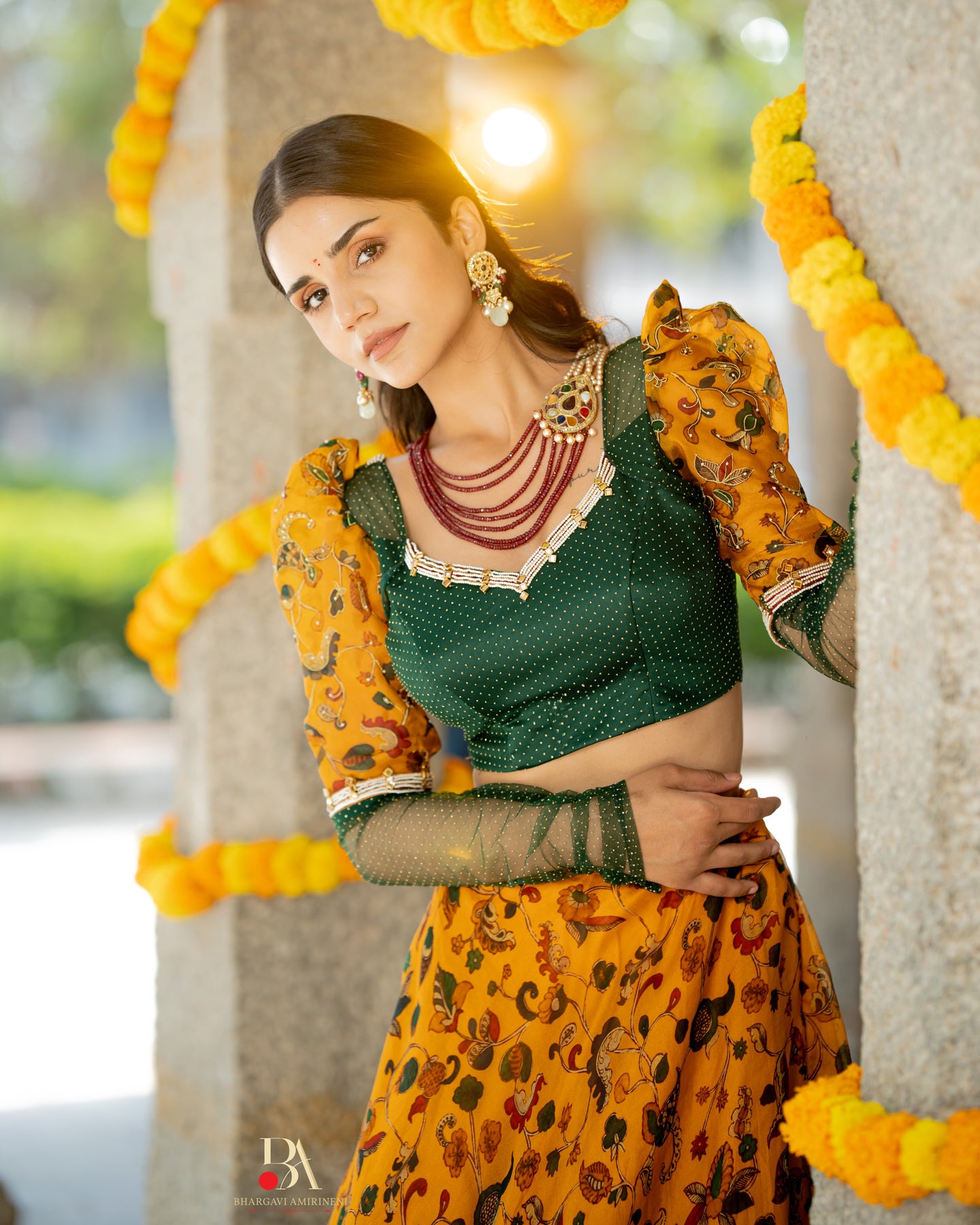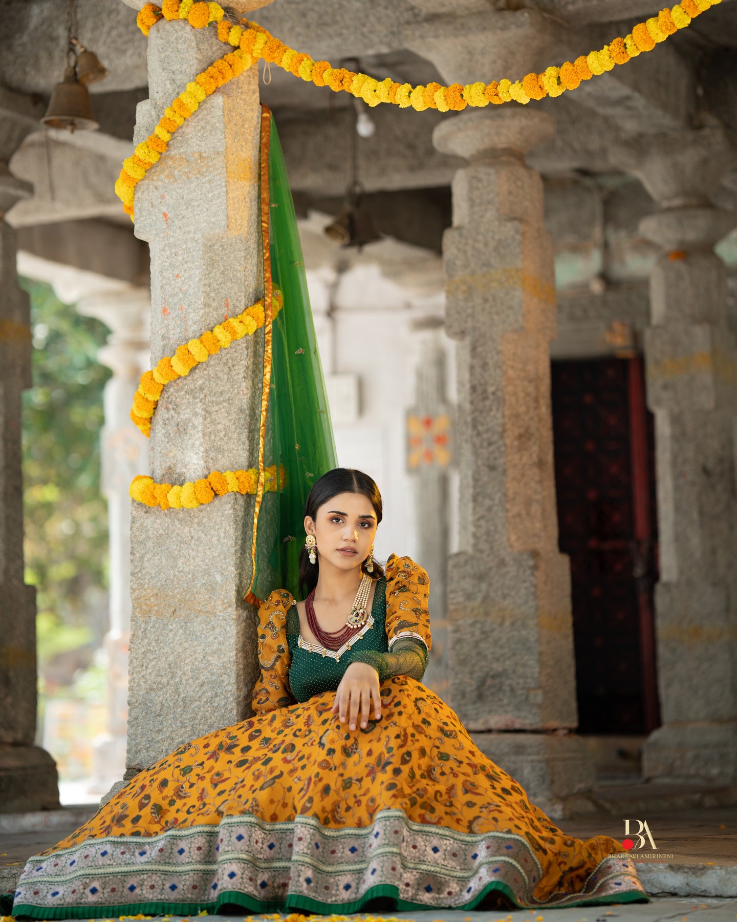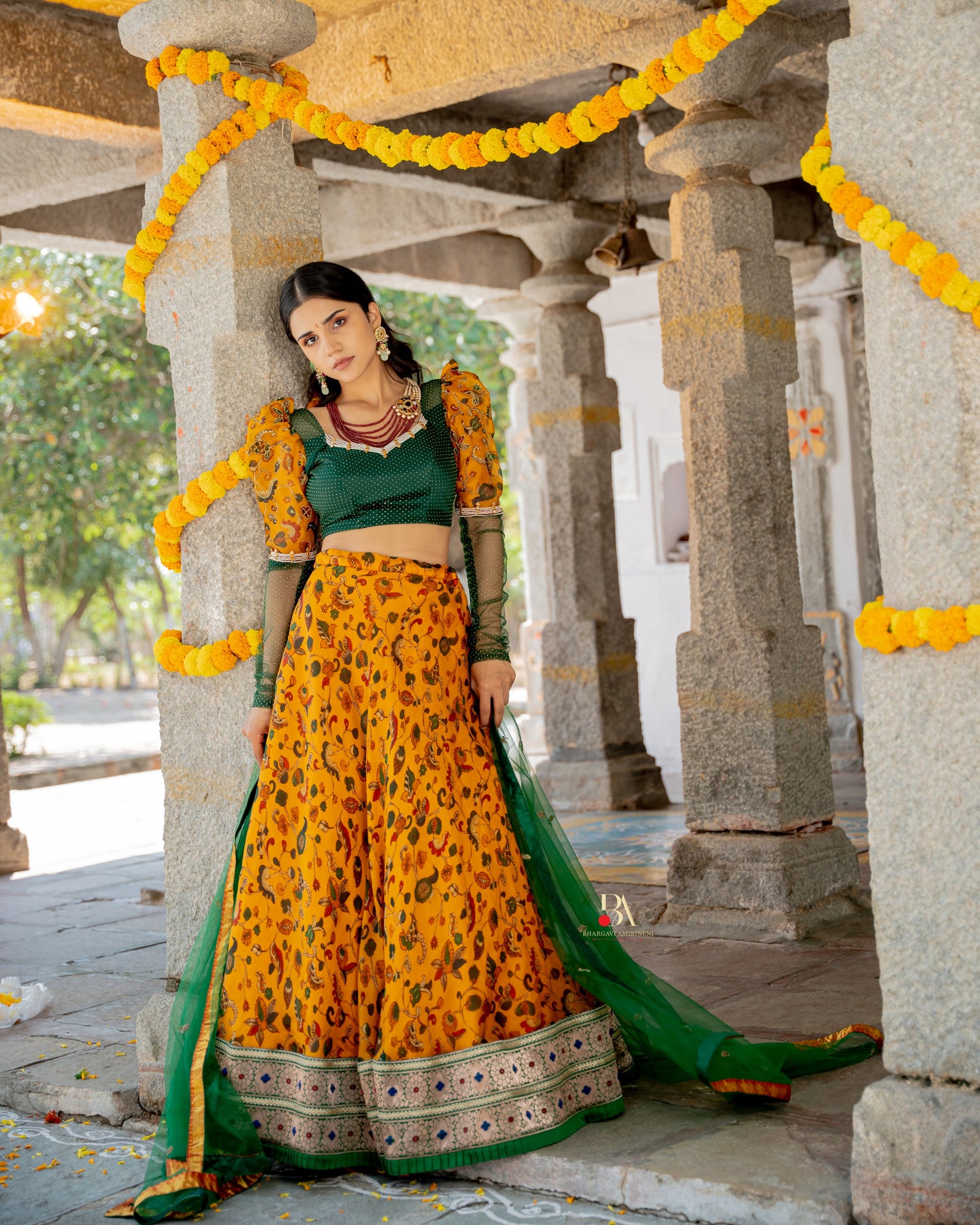 Striking and stylish, this 3-piece mustard yellow lehenga set pairs an amber yellow organza skirt with a dark green net blouse featuring pearl hand embroidery and eccentric sleeves, finished with a matching net dupatta. A perfect balance of subtle contrast and festive flair.