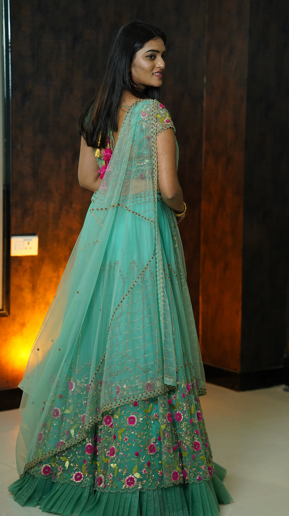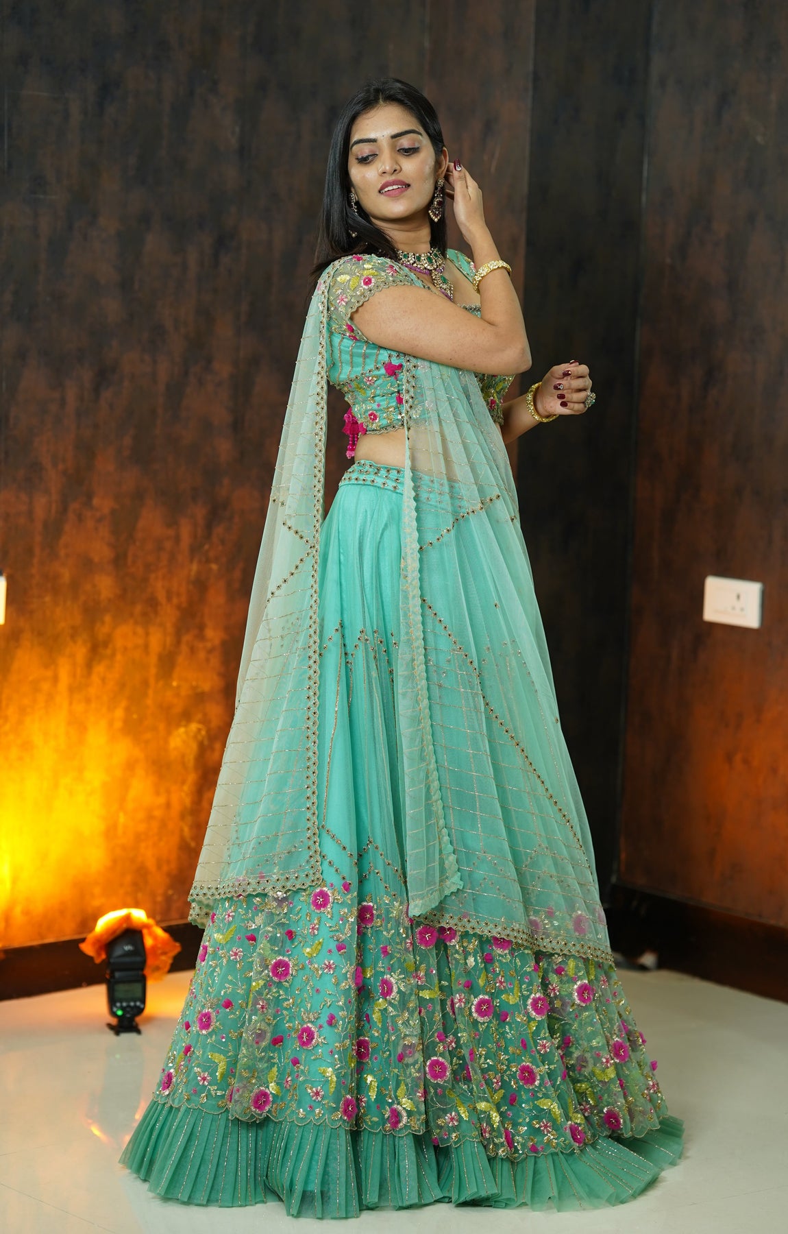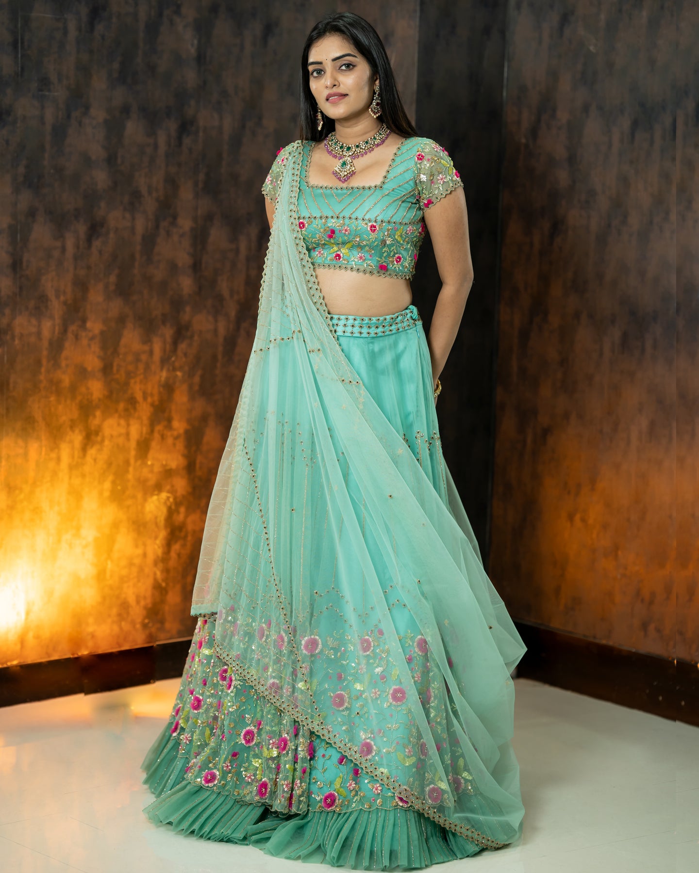 A dreamy 3-piece mint blue lehenga set crafted in net, adorned with pink floral embroidery and soft green accents. Elegant and refreshing, it’s a must-have for celebrations with a touch of whimsy and charm.