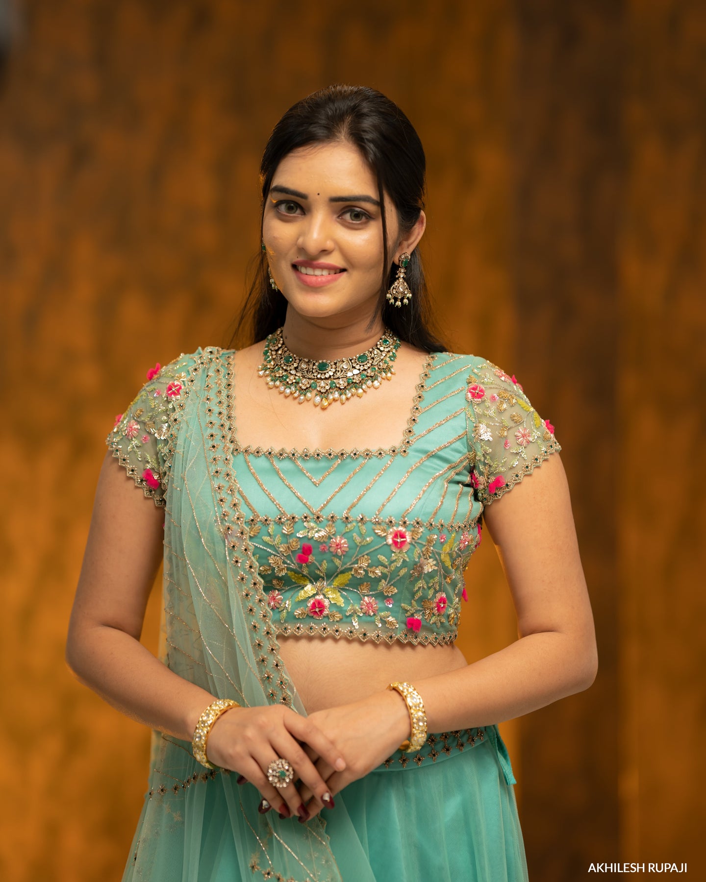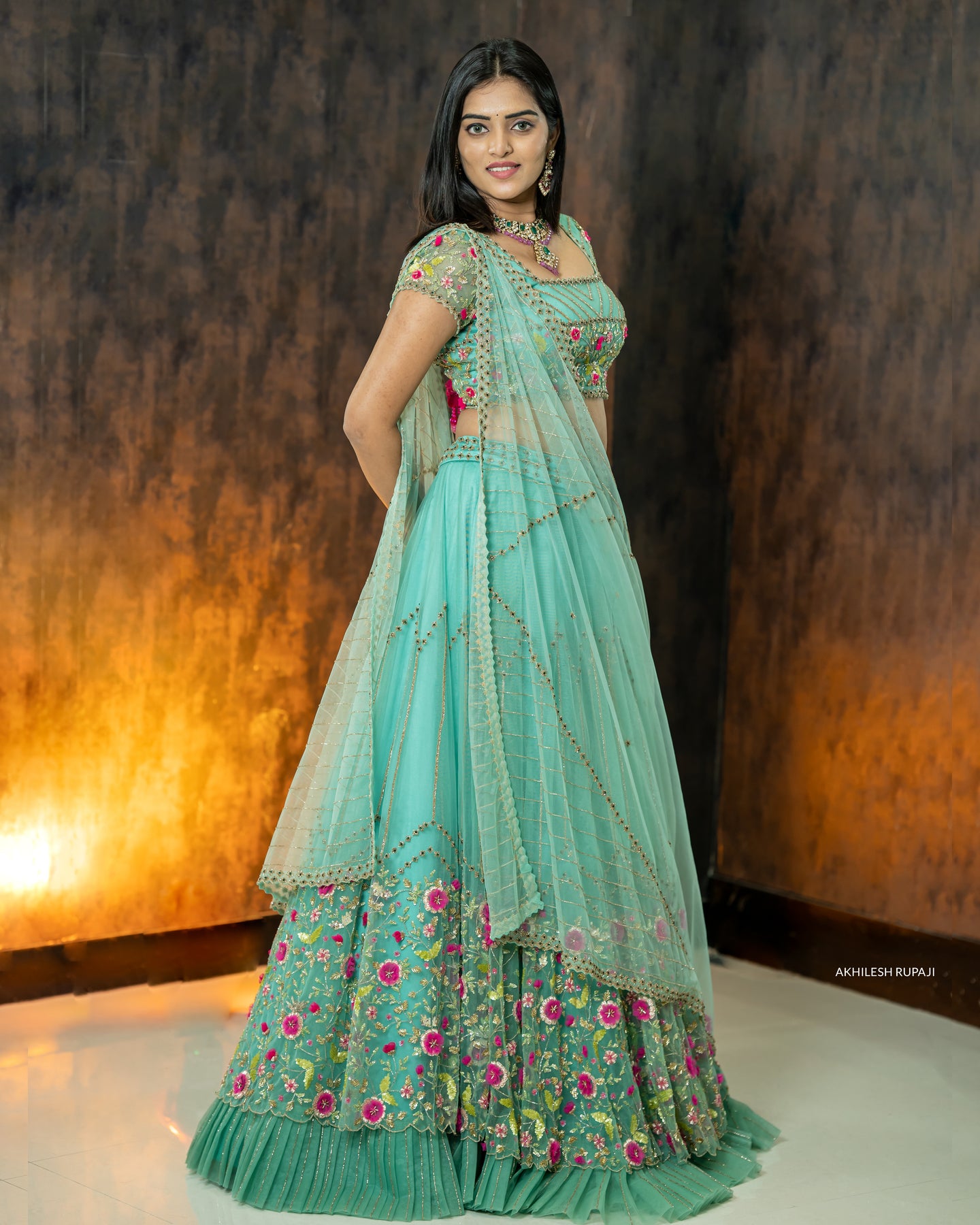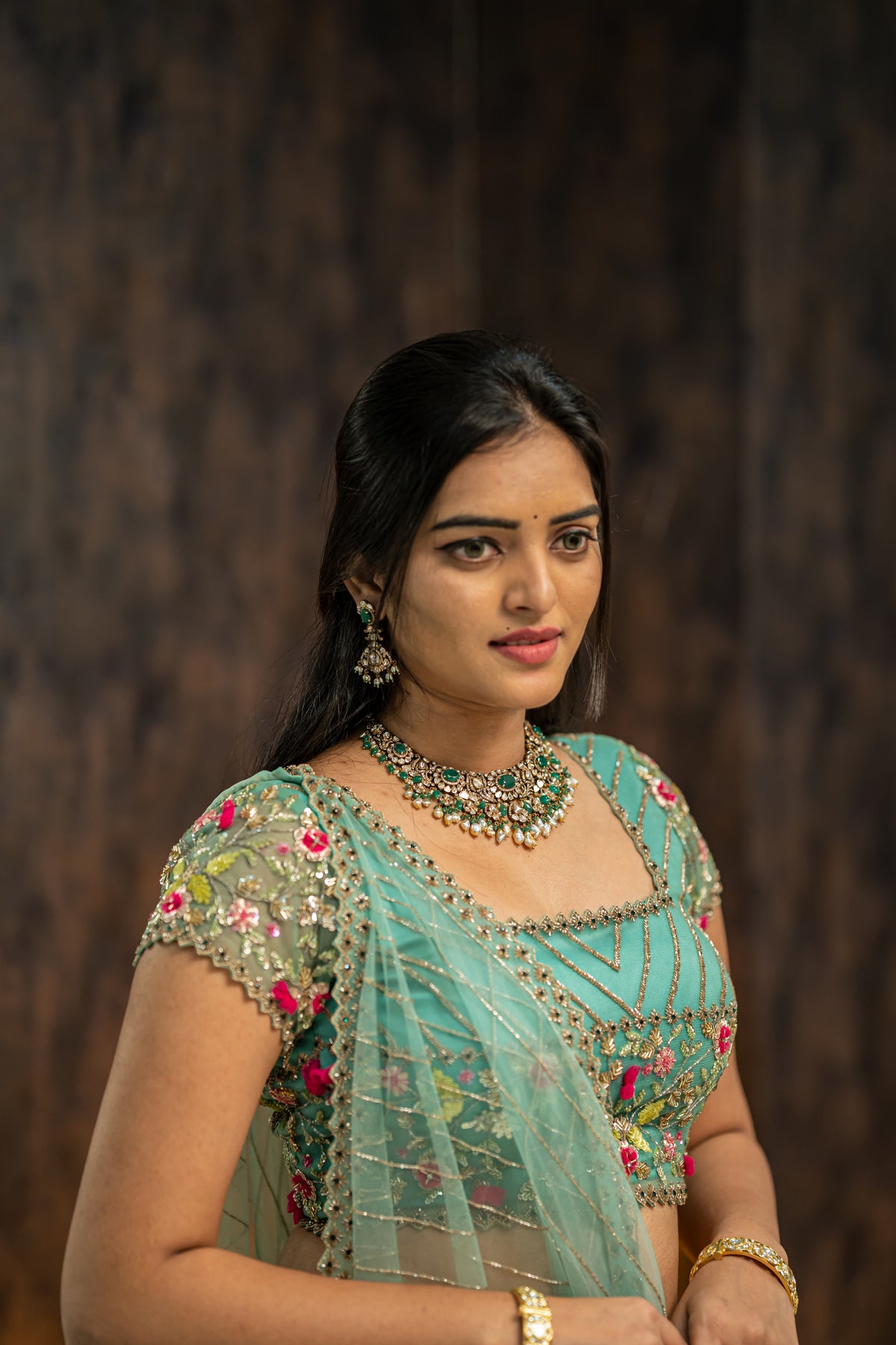 A dreamy 3-piece mint blue lehenga set crafted in net, adorned with pink floral embroidery and soft green accents. Elegant and refreshing, it’s a must-have for celebrations with a touch of whimsy and charm.